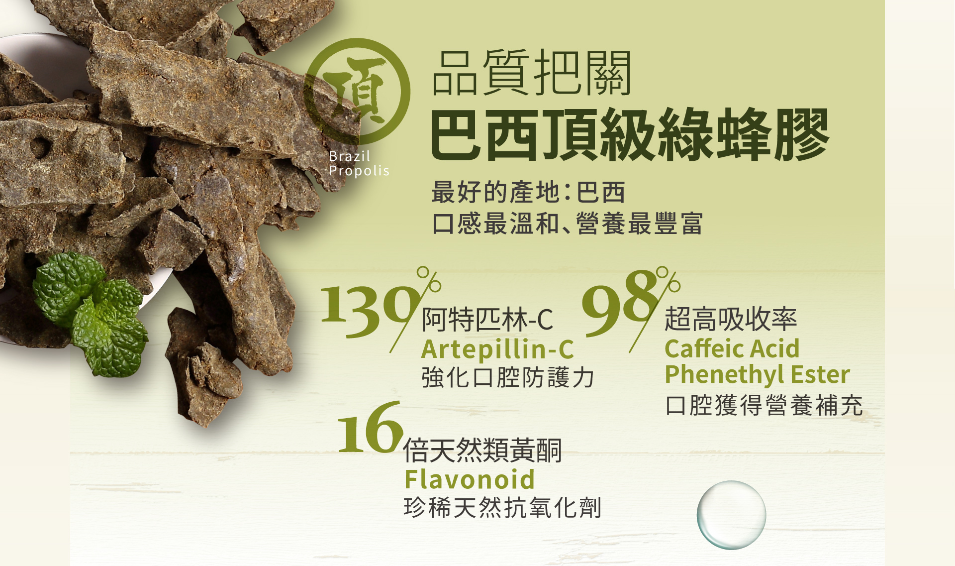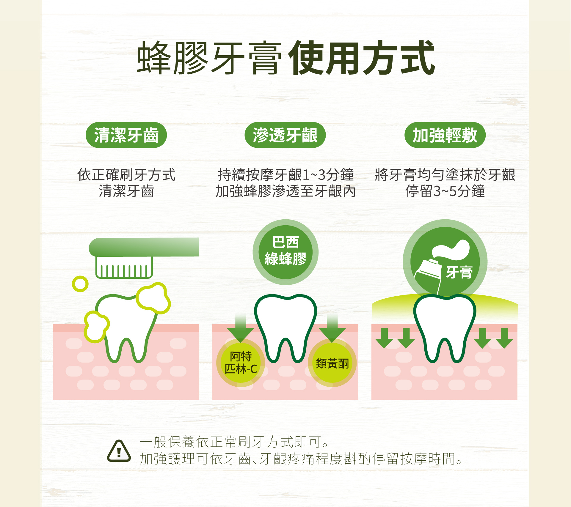 1.牙膏:取適量擠在牙刷上,每次刷牙至少3-5分鐘,幫助蜂膠有效滲透牙膏。