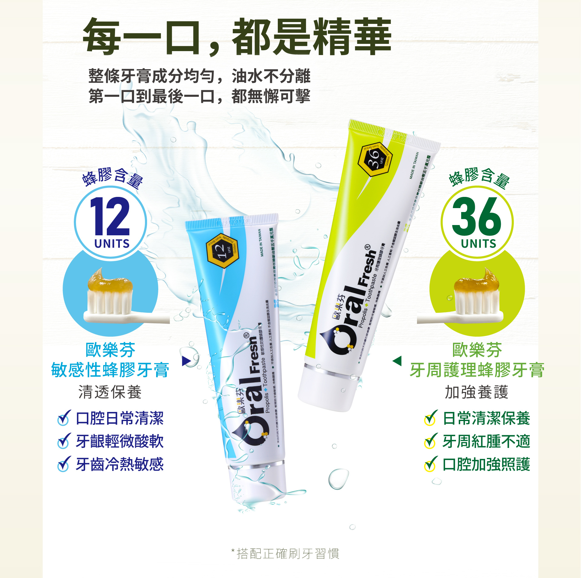 ◇藍牙膏-敏感性防護蜂膠牙膏:針對一般大眾及敏感性牙齒族群設計,獨特添加12units巴西綠蜂膠精華,搭配正確刷牙方式,可緩解及預防牙周酸軟不適,幫助清除牙菌斑、降低牙周病發生機率,幫助強化口腔健康。