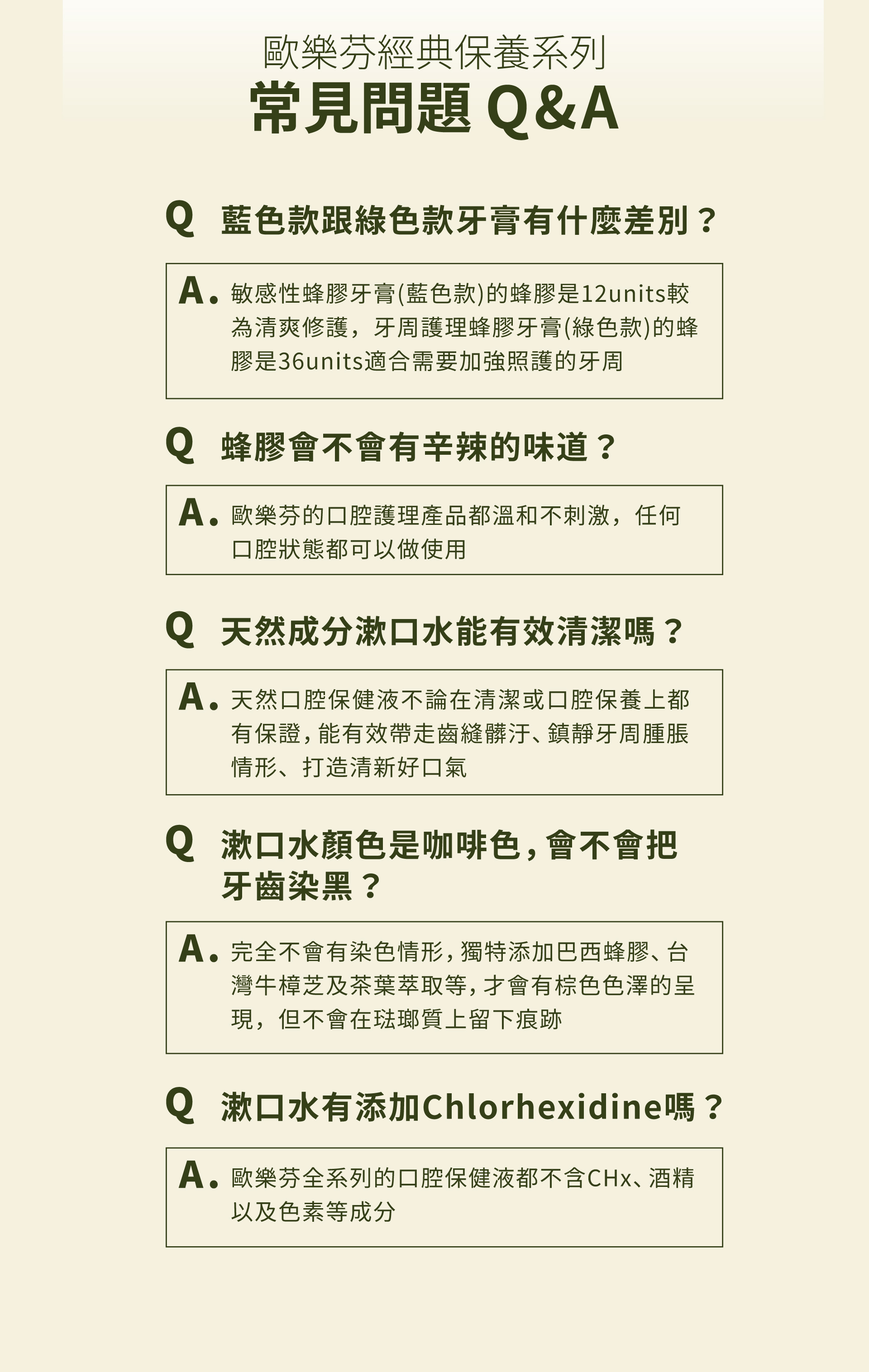 ◇綠牙膏-牙周護理蜂膠牙膏:針對牙齒敏感、牙周不適、牙齦不適、需加強牙周護理者設計,獨特添加36units巴西綠蜂膠精華,搭配正確刷牙方式,可降低因牙周不健康所引起的牙周不適、牙齦不適感,同時幫助清除牙菌斑、降低牙周病發生機率,幫助促進口腔健康。