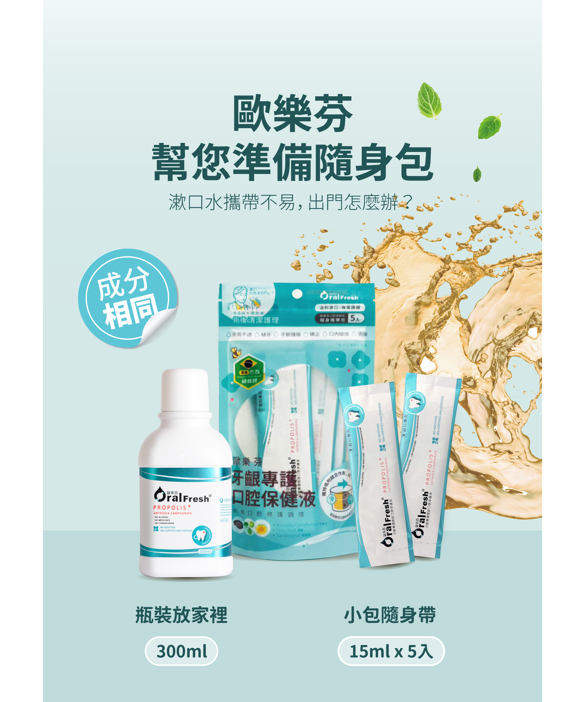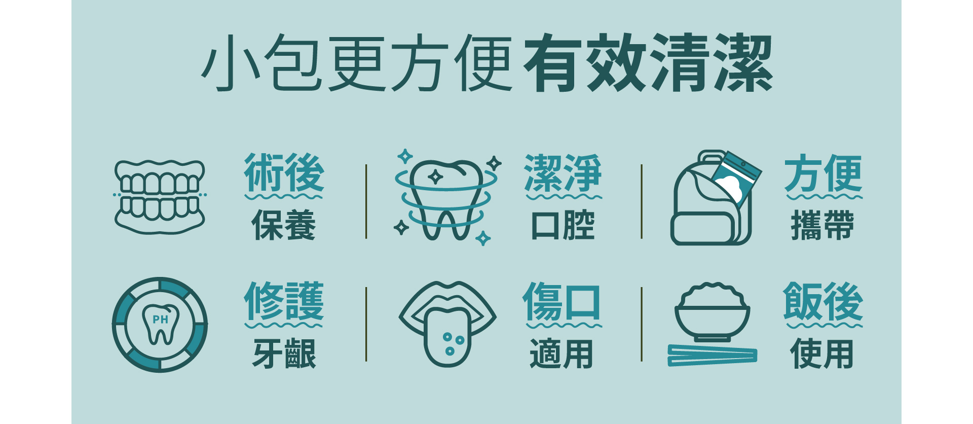 專為口腔問題、牙周術後者設計,口感溫和不刺激,接受度高。配合正確刷牙習慣後使用,可有效舒緩牙周術後的不適感,並幫助對抗牙菌斑、降低牙周病發生率,幫助改善口腔健康。牙周術後護理者可長期使用。