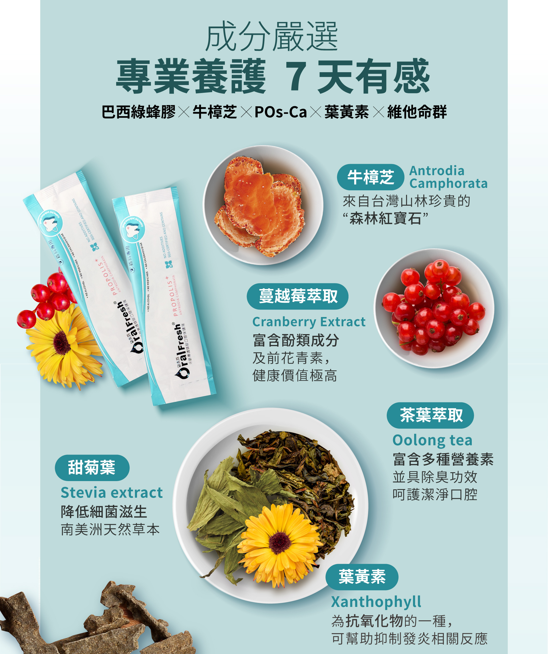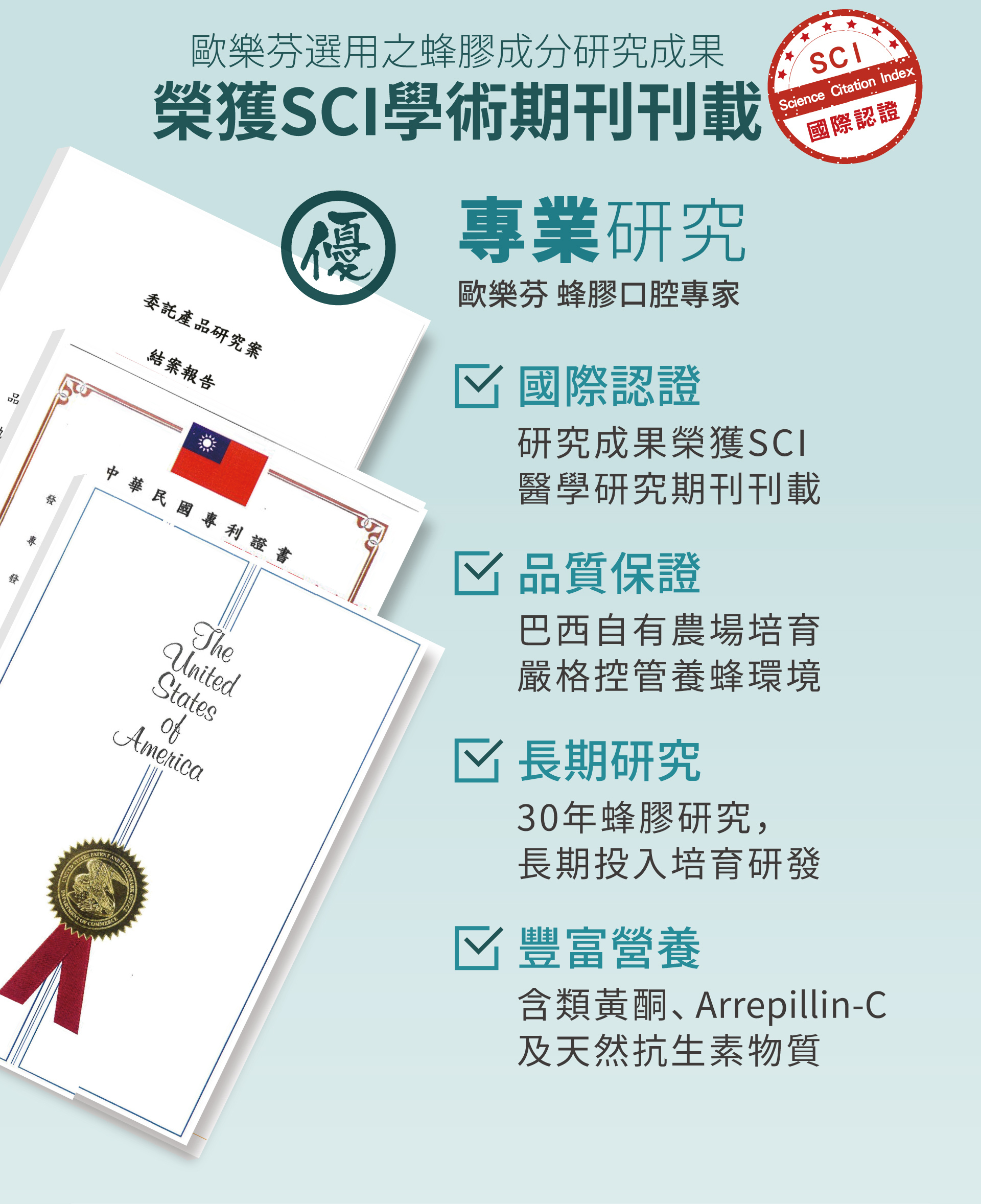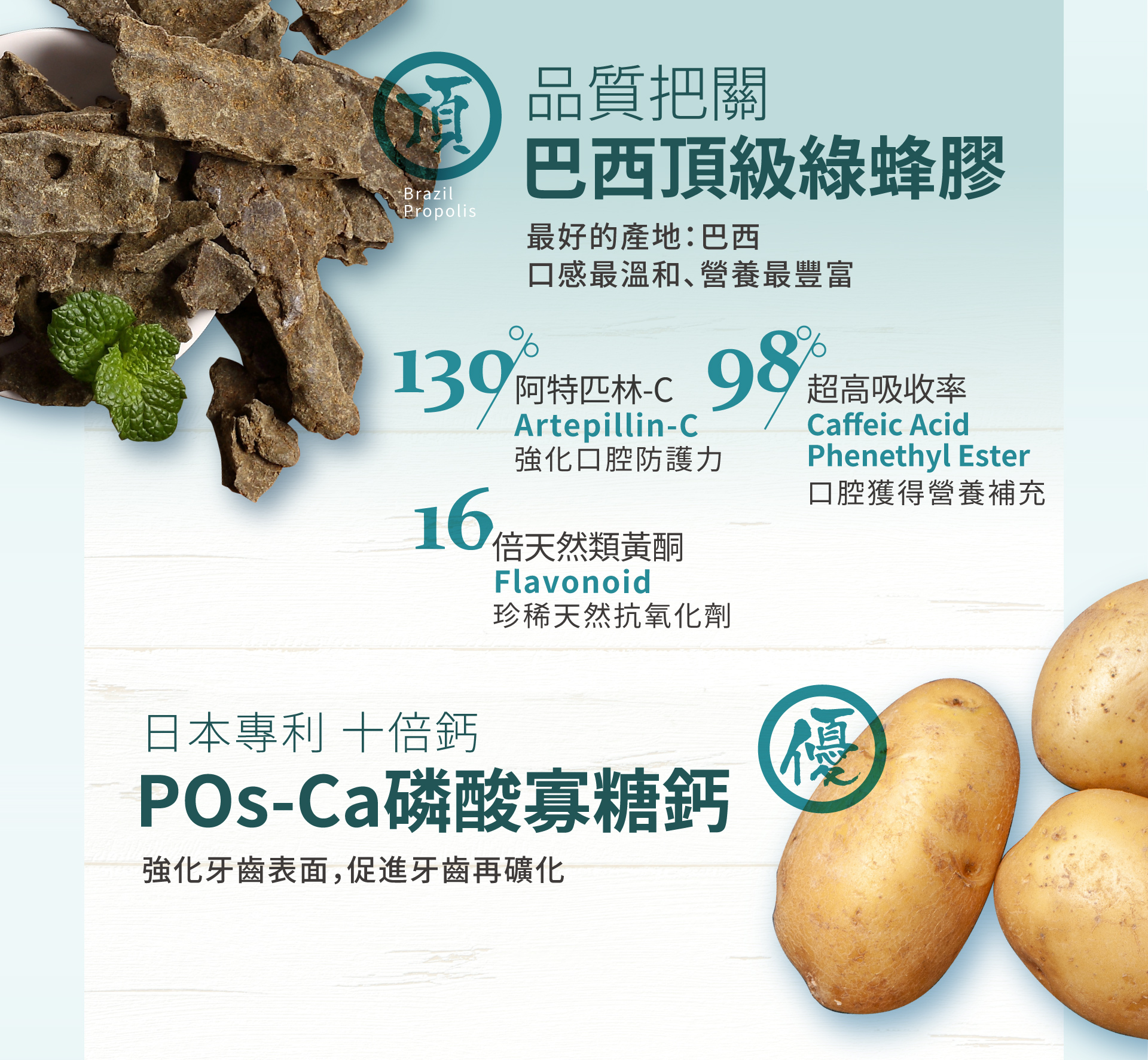 巴西自有農場頂級綠蜂膠、台灣牛樟芝、日本專利POs-Ca水溶性鈣質、葉黃素