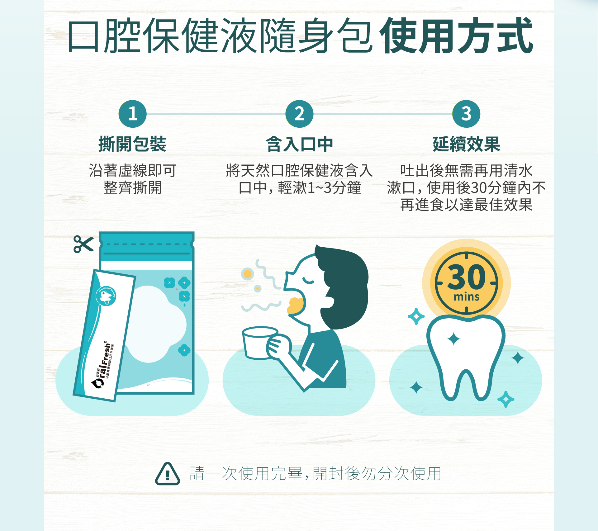 1.使用前請先搖勻,每次以15ml做口腔清潔,含口中並輕輕漱口,一分鐘左右吐出即可。*每包請一次使用完畢,勿分次使用