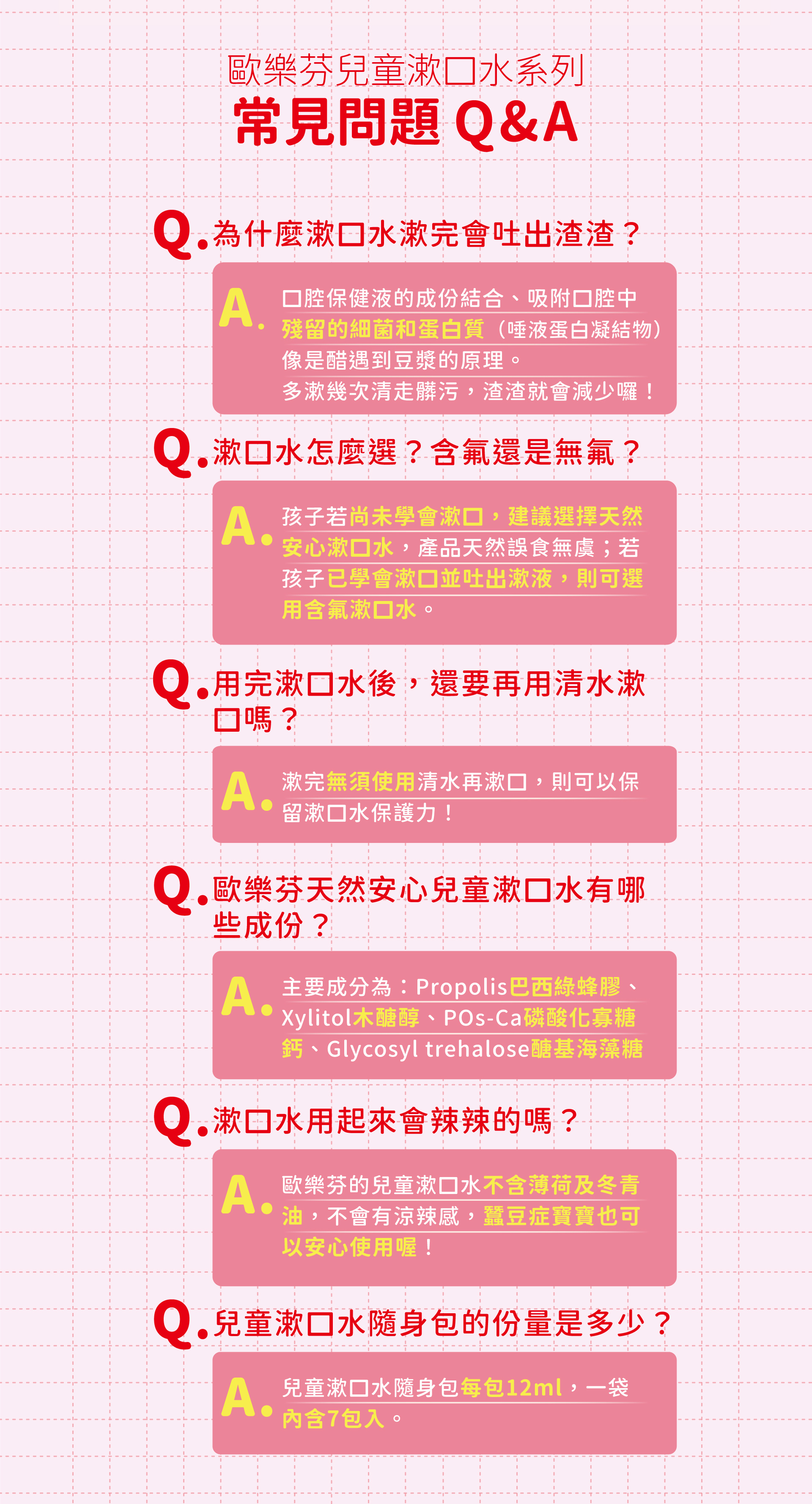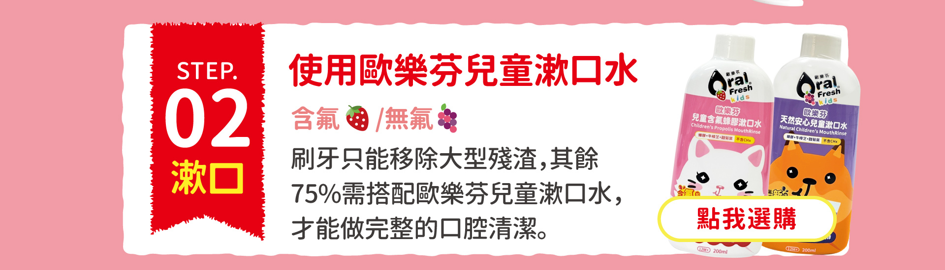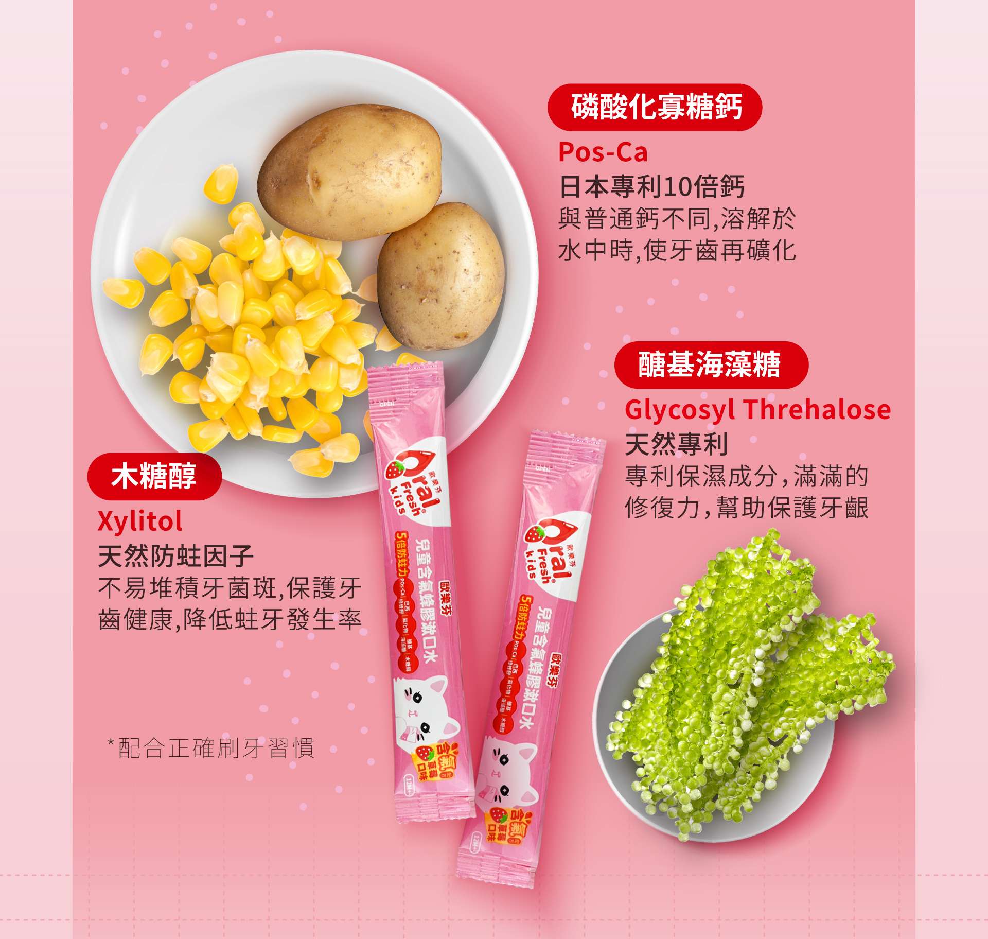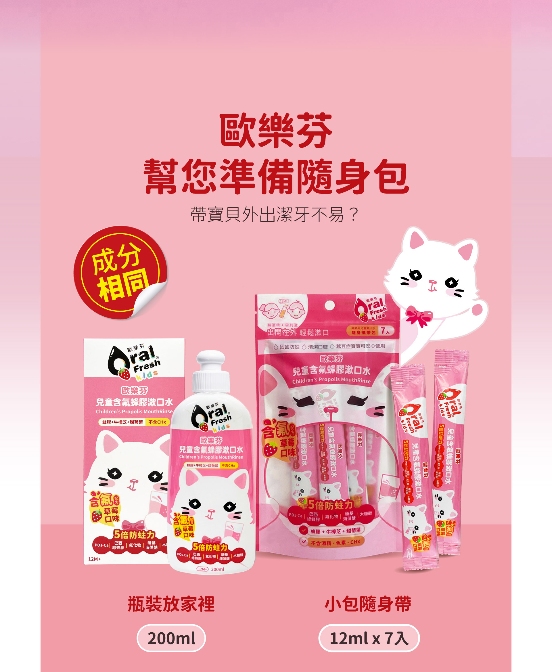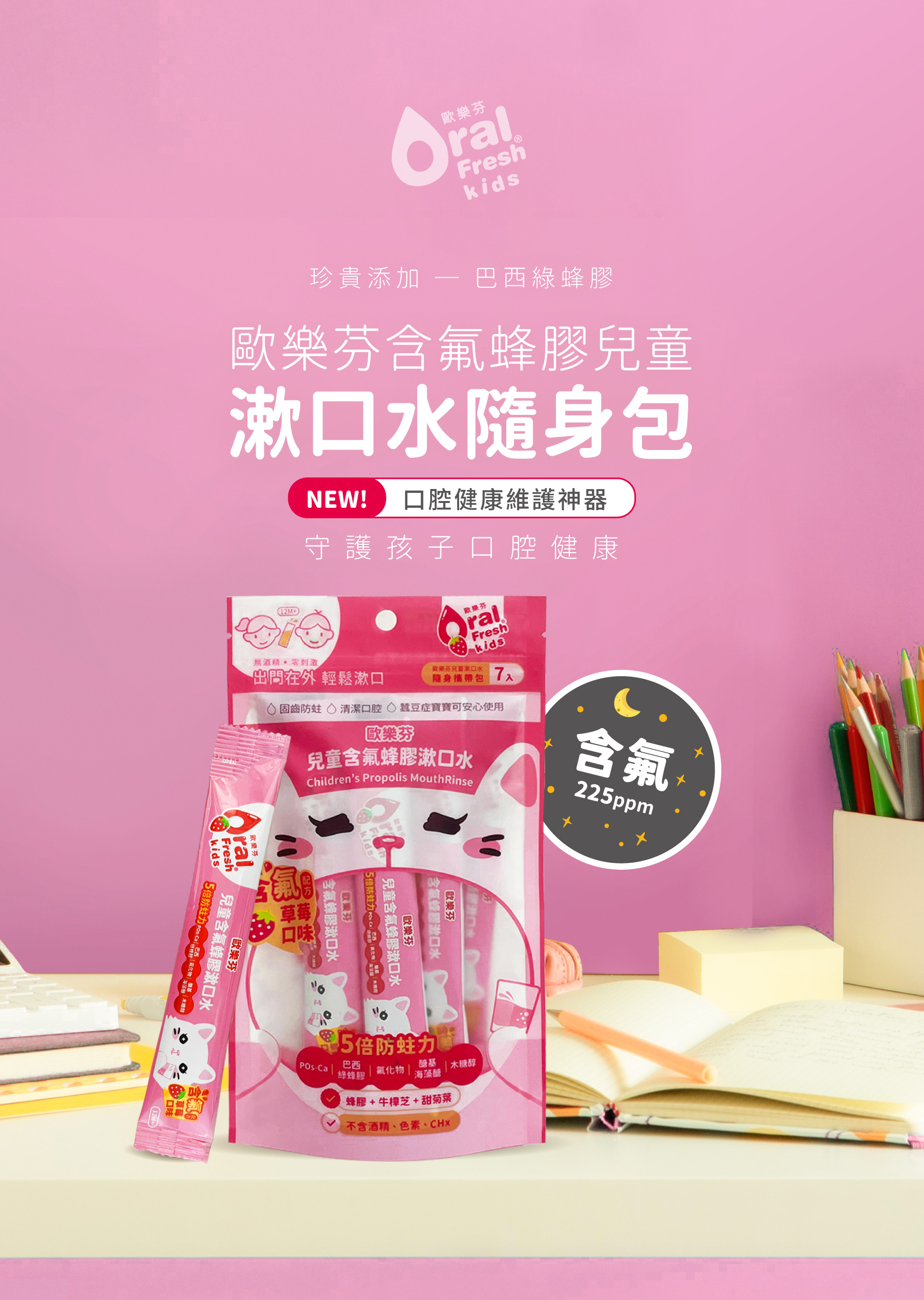 含氟配方兒童漱口水,5倍防蛀力成分升級,強化琺瑯質並預防齲齒,不含涼感及酒精,草莓口味孩子接受度高。初長牙嬰童、一般幼童皆可使用,將刷牙無法清潔到的部分做口腔清潔。