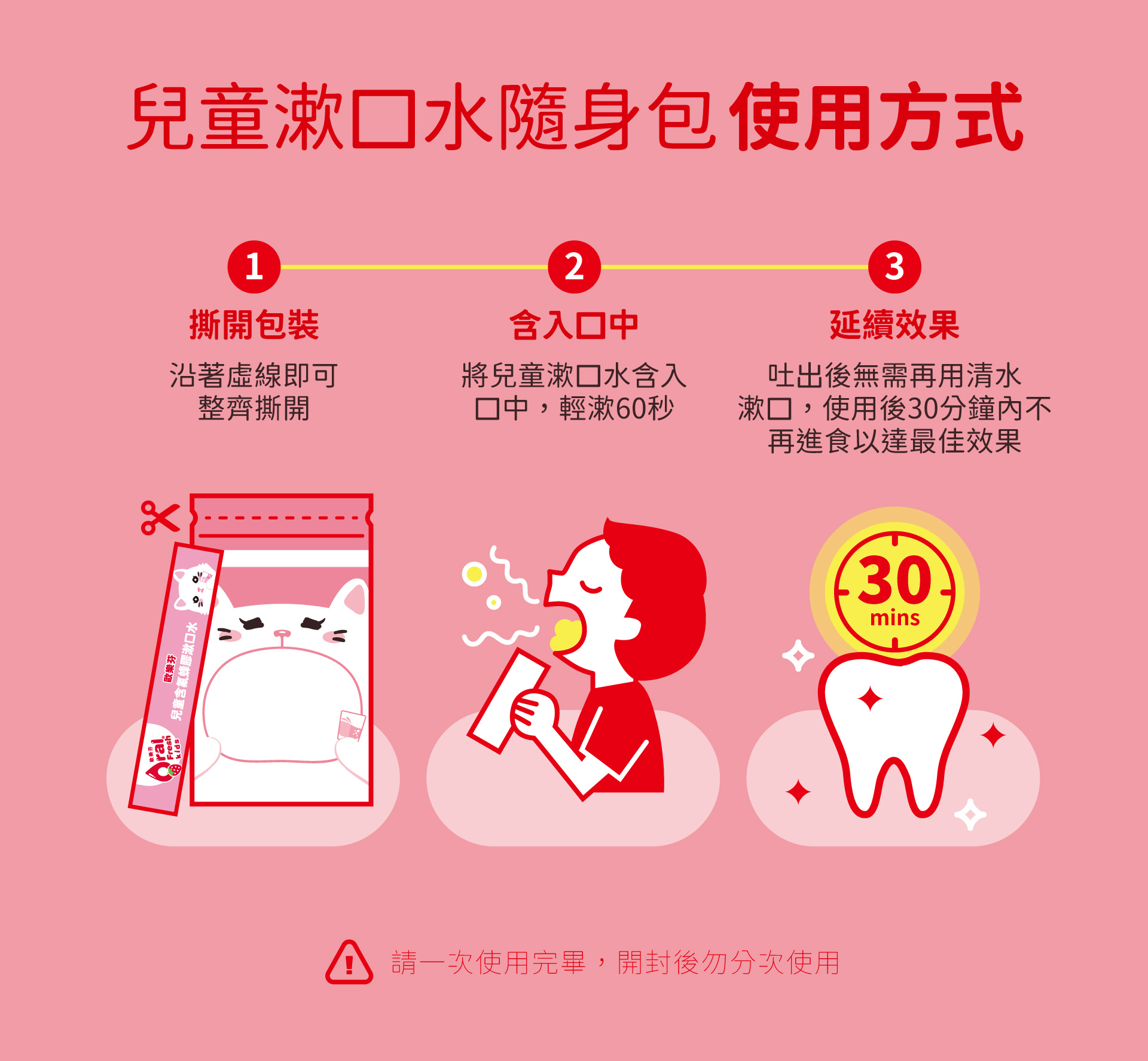 3.初期使用,需有家長在旁協助教導正確漱口方式。