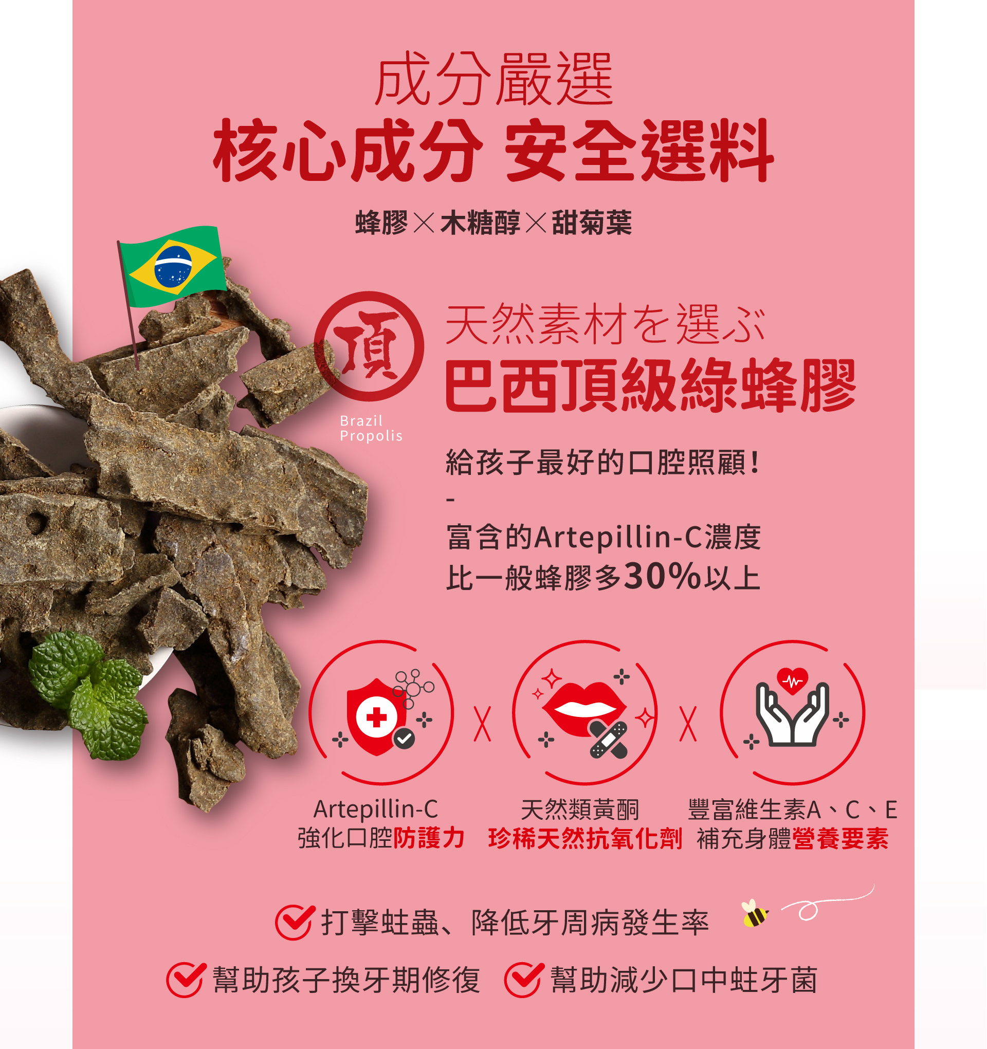 自有農場巴西頂級綠蜂膠、氟化物(225PPM)、POs-Ca、醣基海藻醣、木糖醇、牛樟芝萃取