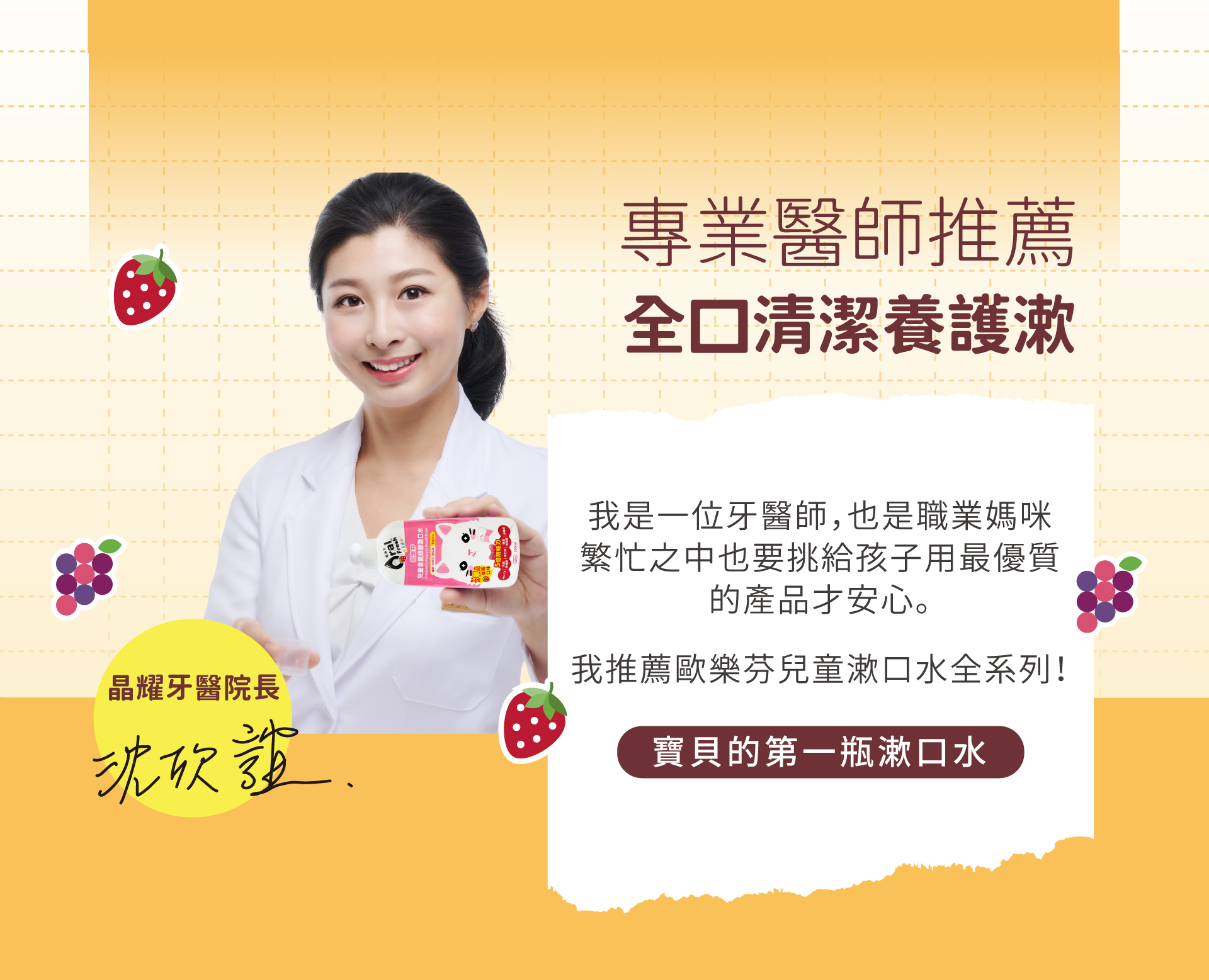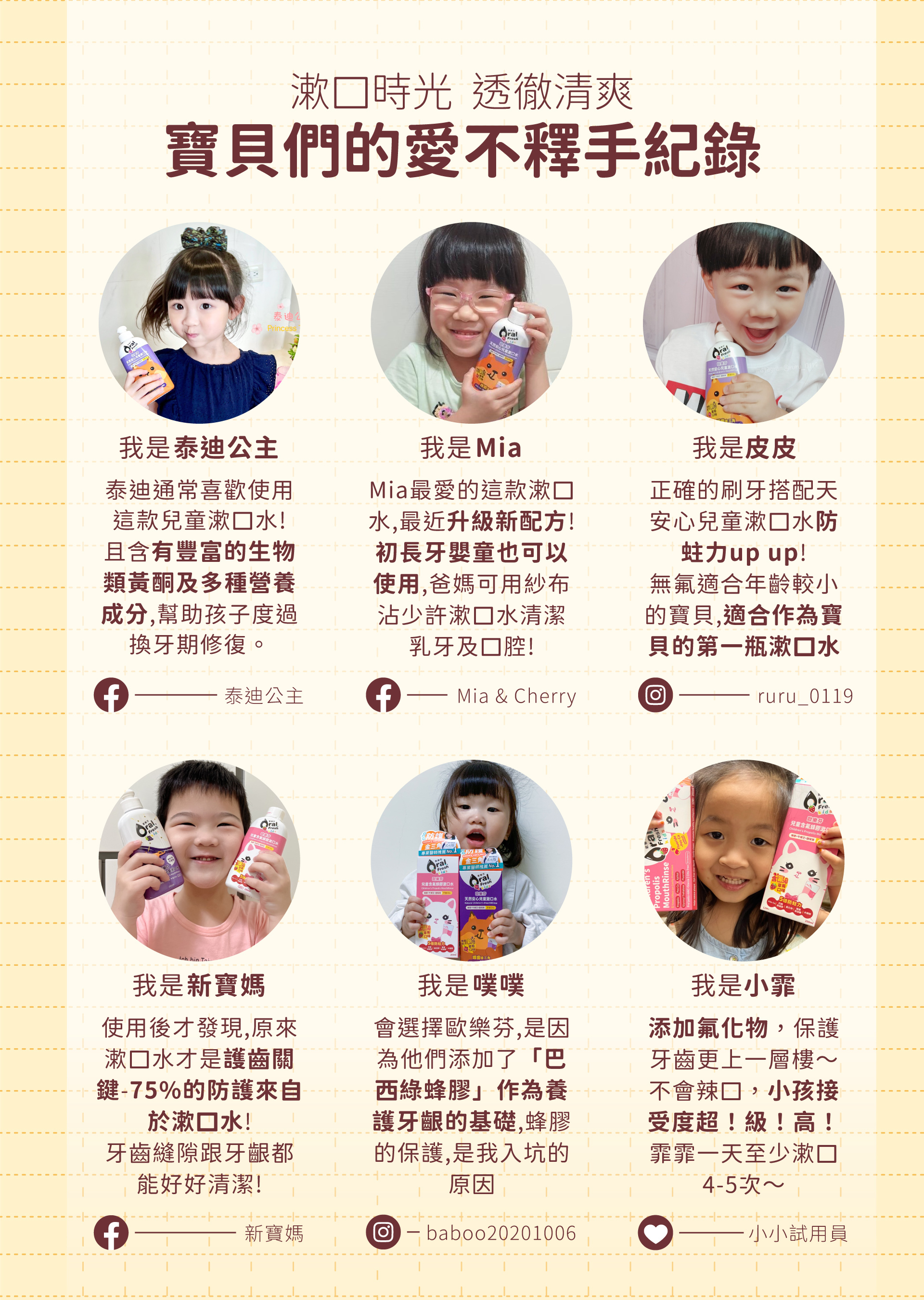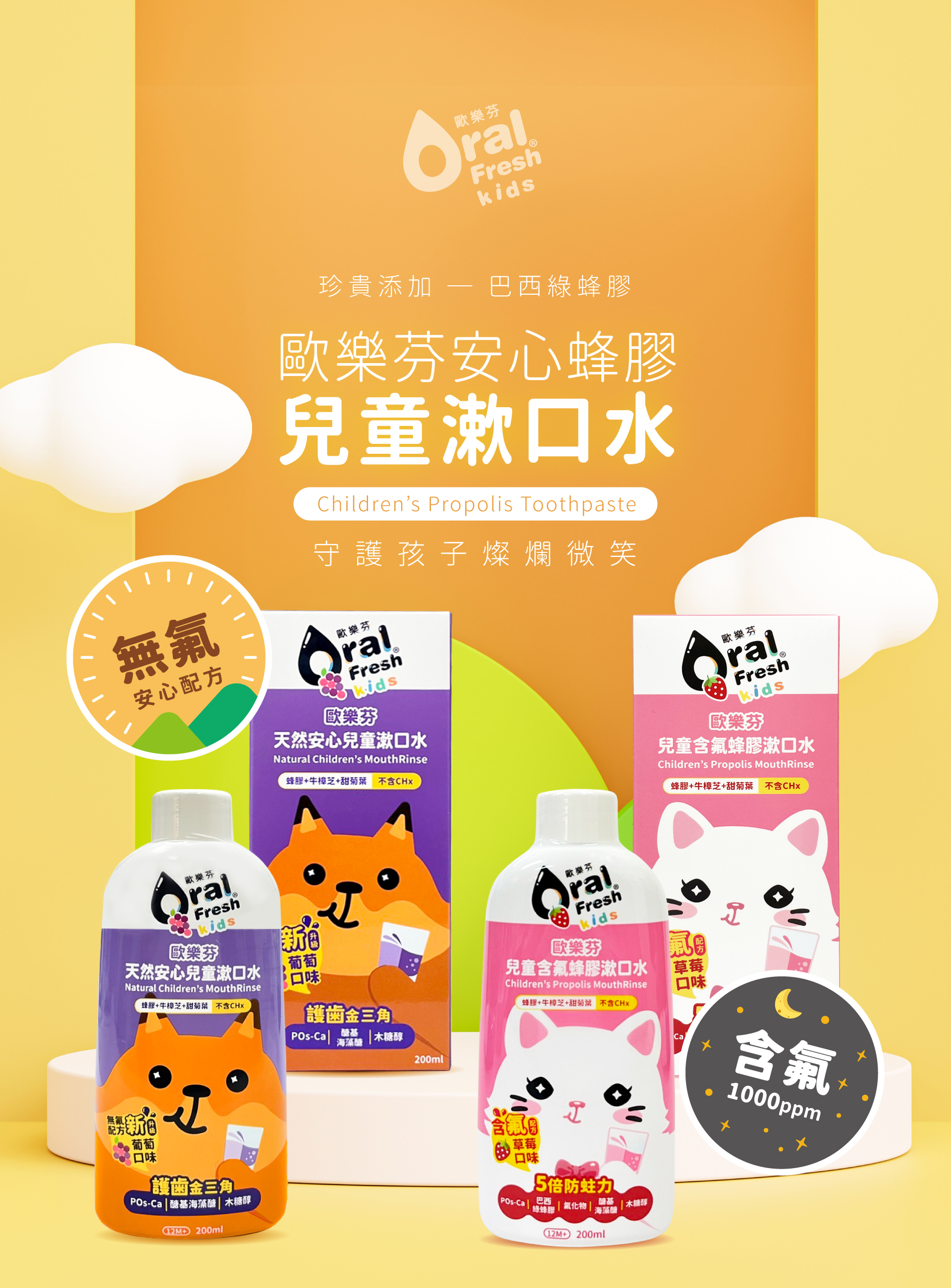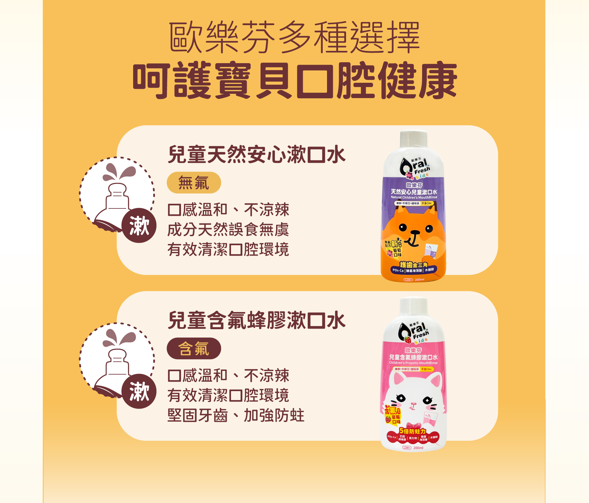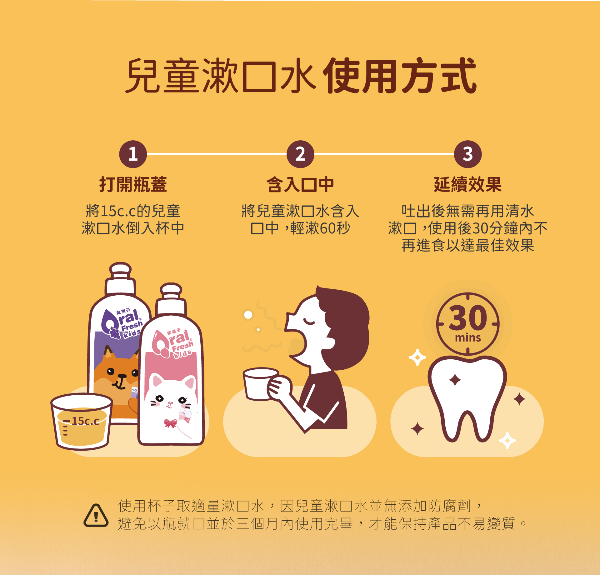 初長牙嬰童、一般幼童皆可使用,將刷牙無法清潔到的部分做口腔清潔。兒童安心配方,兒童自主學習潔牙的第一瓶漱口水,成分升級,加強保濕、防蛀成分,強化琺瑯質並預防齲齒,不含涼感及酒精,水果口味孩子接受度高。初長牙嬰童、一般幼童皆可使用,將刷牙無法清潔到的部分做口腔清潔。