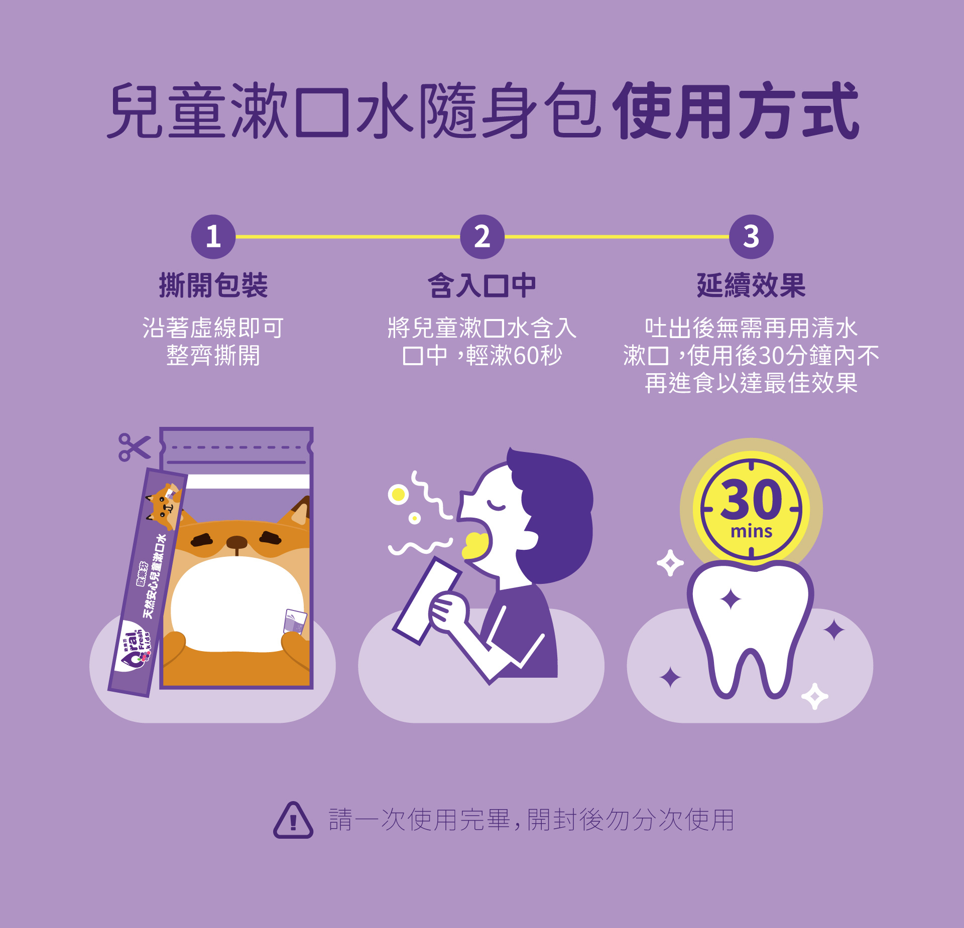 初長牙嬰童、一般幼童皆可使用,將刷牙無法清潔到的部分做口腔清潔。兒童安心配方,兒童自主學習潔牙的第一瓶漱口水。