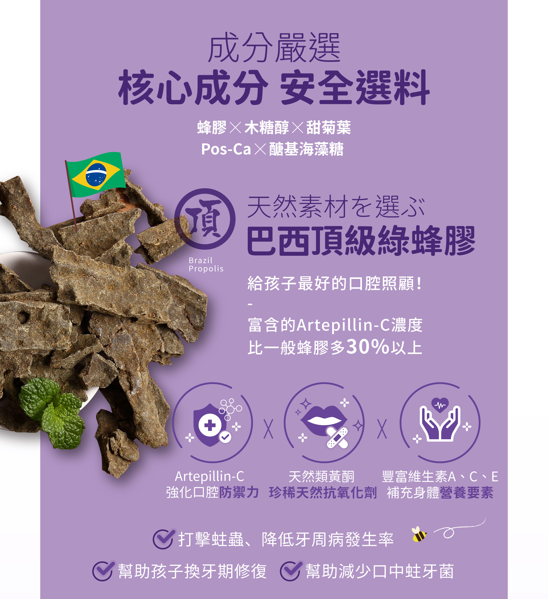 自有農場巴西頂級綠蜂膠、日本水溶性十倍鈣POs-Ca、醣基海藻醣、木醣醇、甜菊葉、台灣牛樟芝