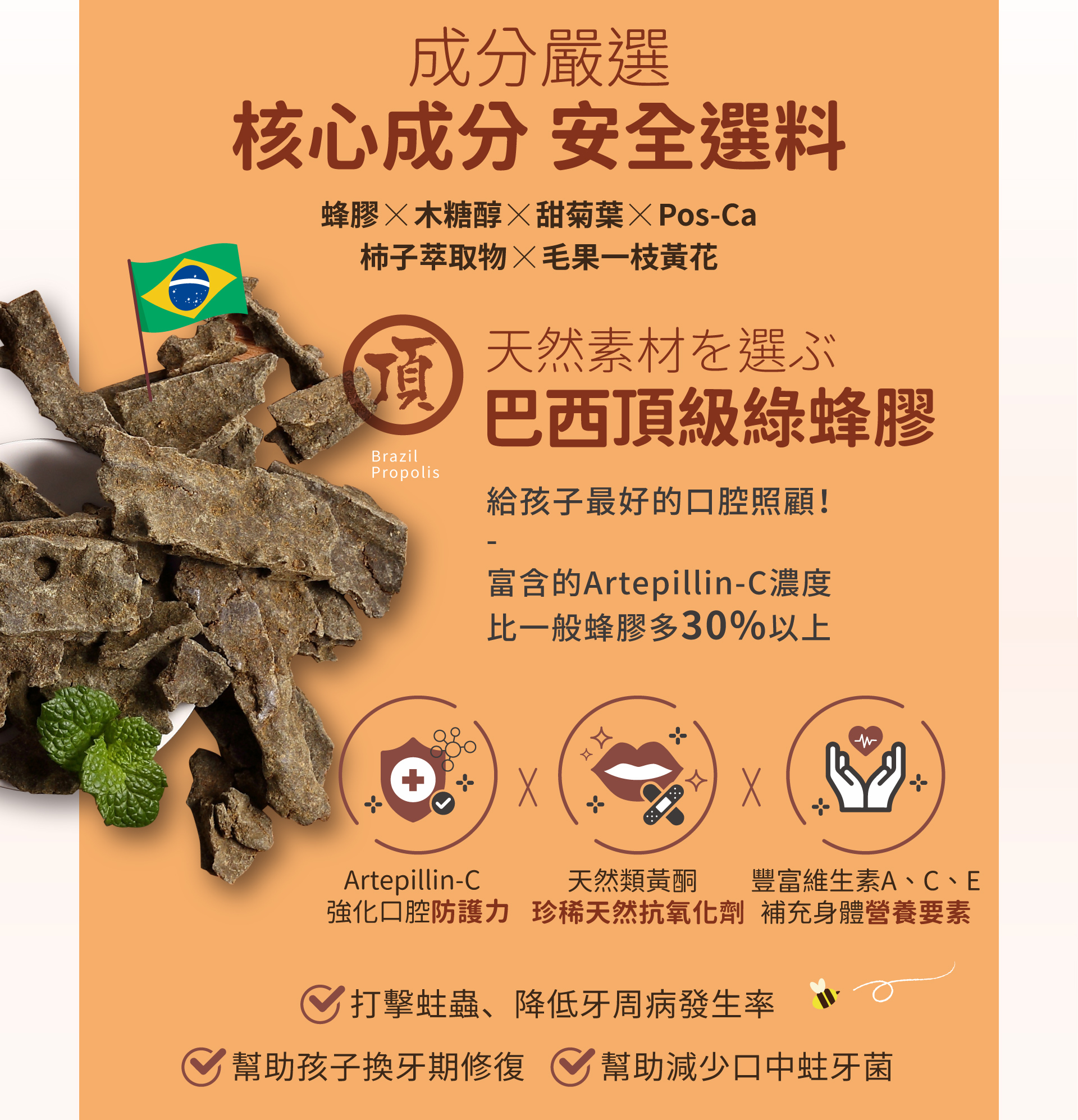 自有農場巴西頂級綠蜂膠、日本專利水溶性十倍鈣POs-Ca、日本專利柿單寧、甜菊葉、木醣醇